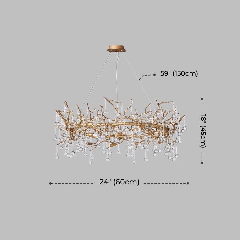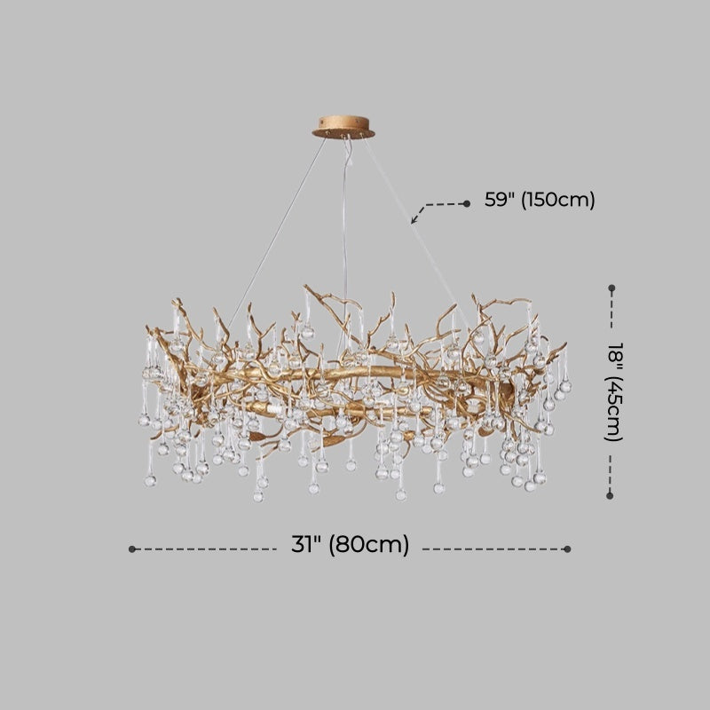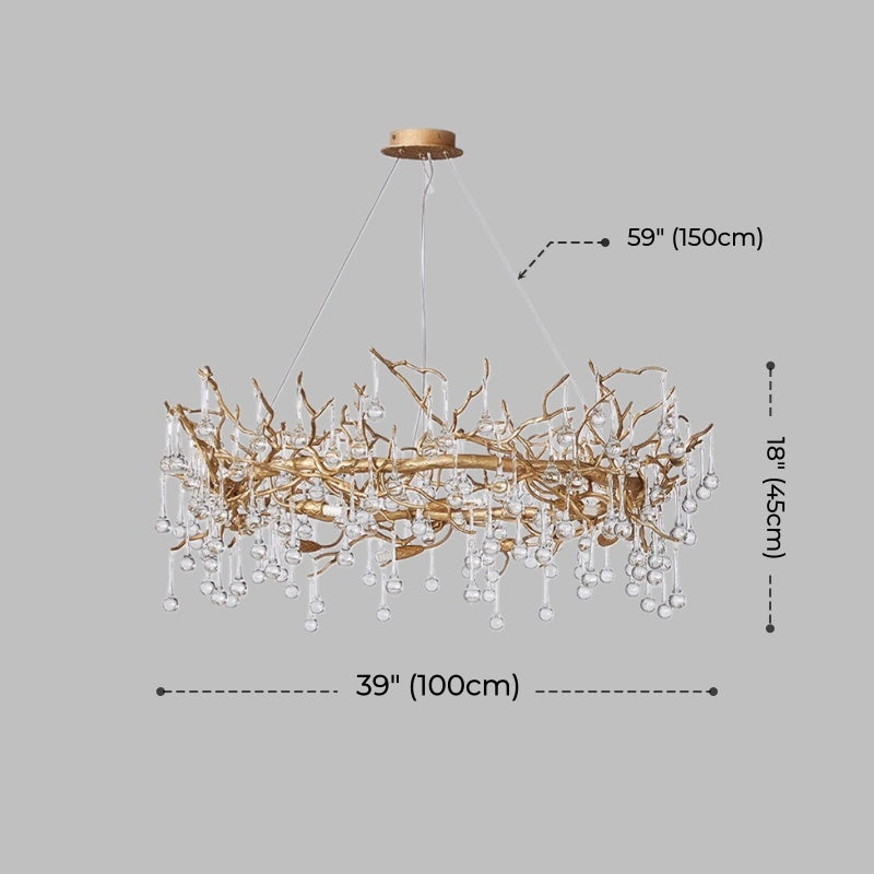 This Branch Crystal Chandelier features a wreath-inspired circular branch frame adorned with sparkling K9 crystal drops for a look that feels airy, romantic, and elegantly sculptural. Finished in warm gold-toned copper, it captures the beauty of frost-covered branches with delicate shimmer and organic movement. Available in 60 cm, 80 cm, 100 cm, and 140 cm, it is ideal for living rooms, dining rooms, foyers, bedrooms, and statement interiors. Branch Design: wreath-like form adds organic elegance. K9 Crystal: sparkling drops create bright, refined shimmer. Gold Frame: warm finish enhances the natural sculptural look. Size Options: available in multiple diameters for different spaces.