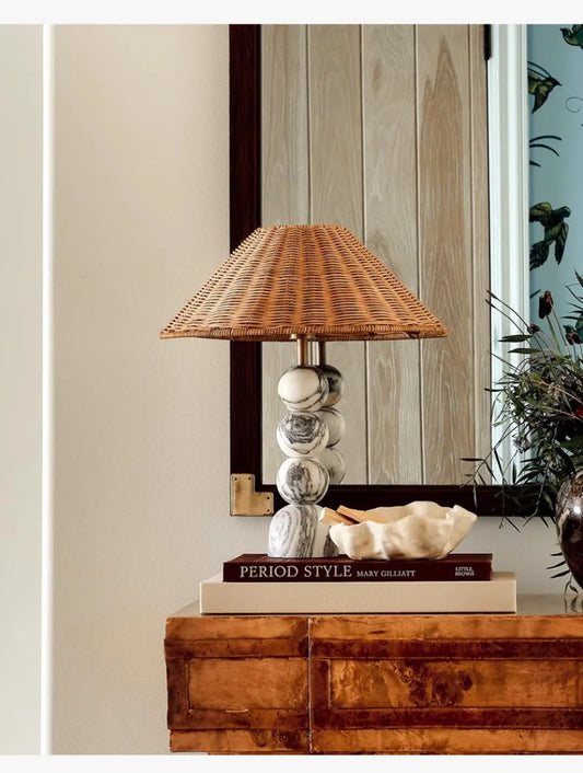 Italian Designer Round Marble Table Lamp with Rattan