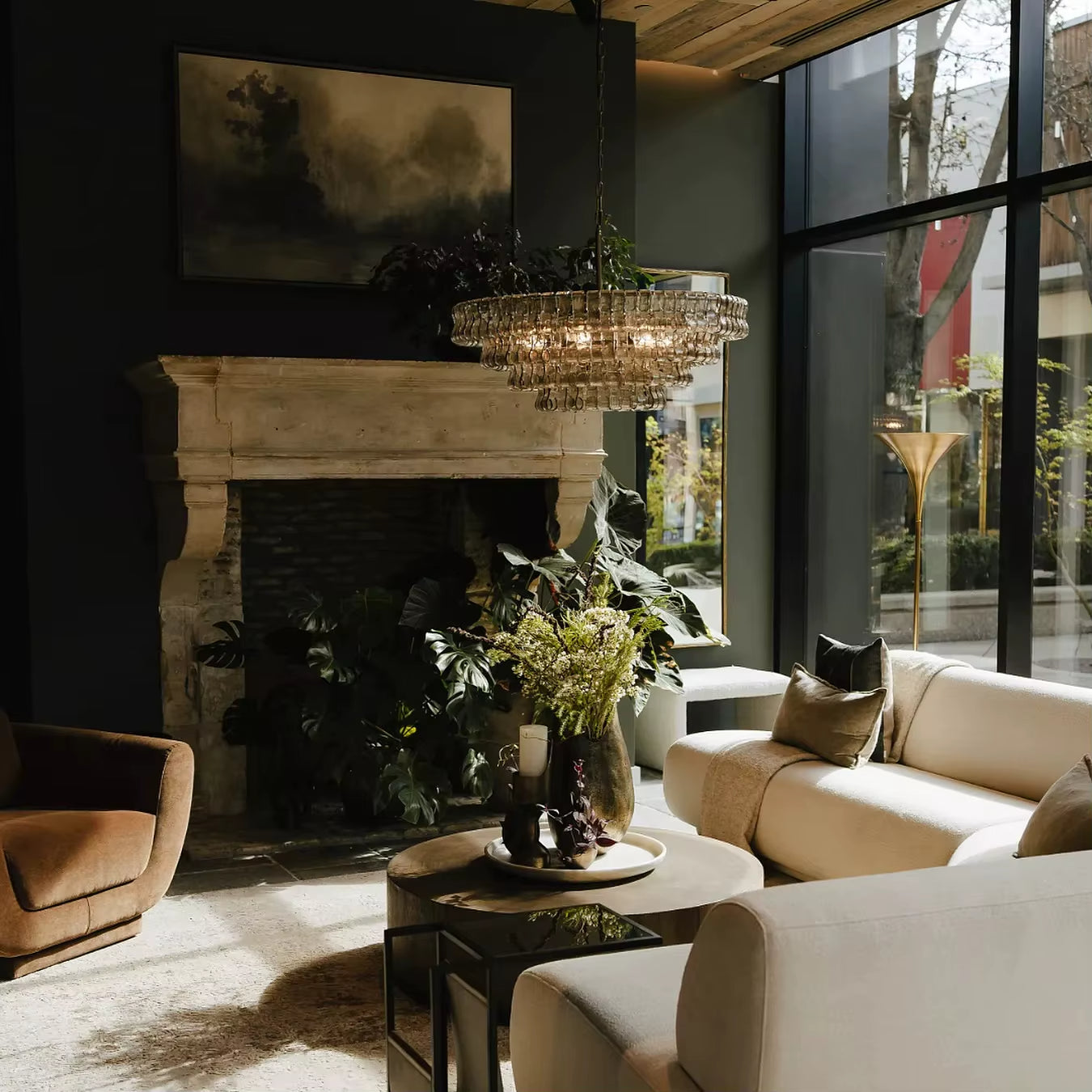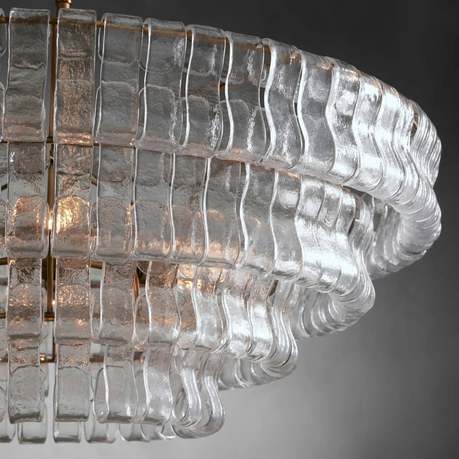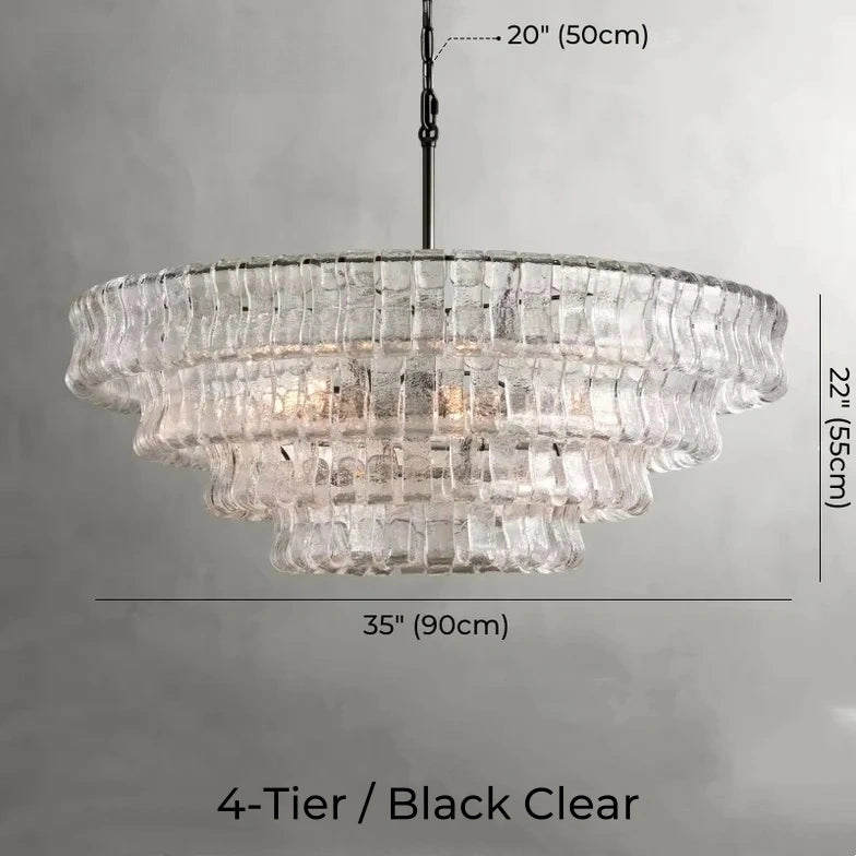 The Juliet Multi-Tier Crystal Chandelier in Clear features frosted ice-like glass bars arranged around four layered round frames in gold or black finish. Its sculptural elegance and shimmering clarity make it a striking focal point for modern dining or living spaces. Chain length: 20"(50cm).