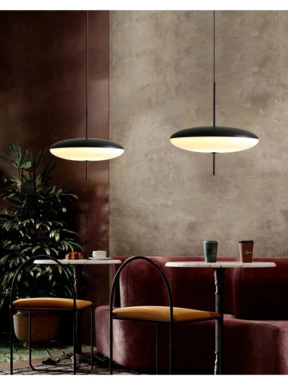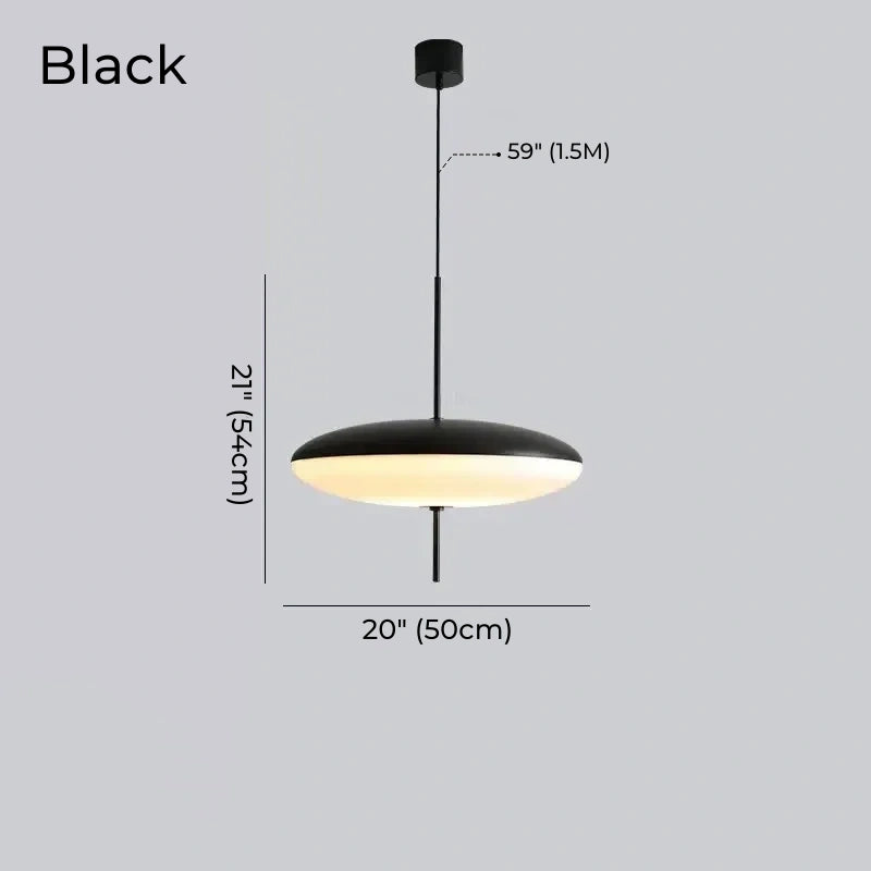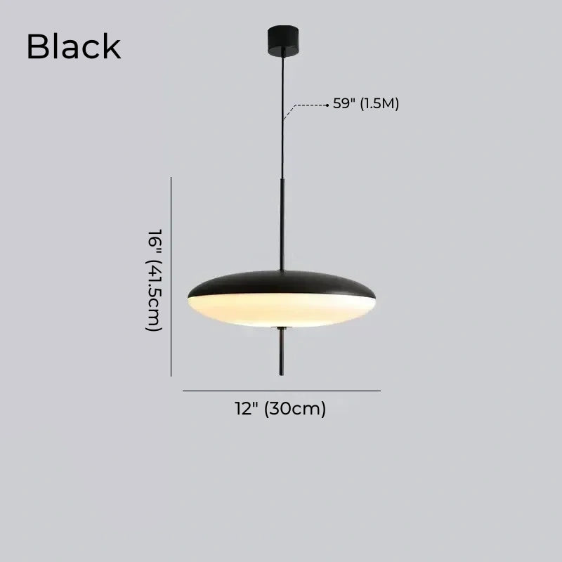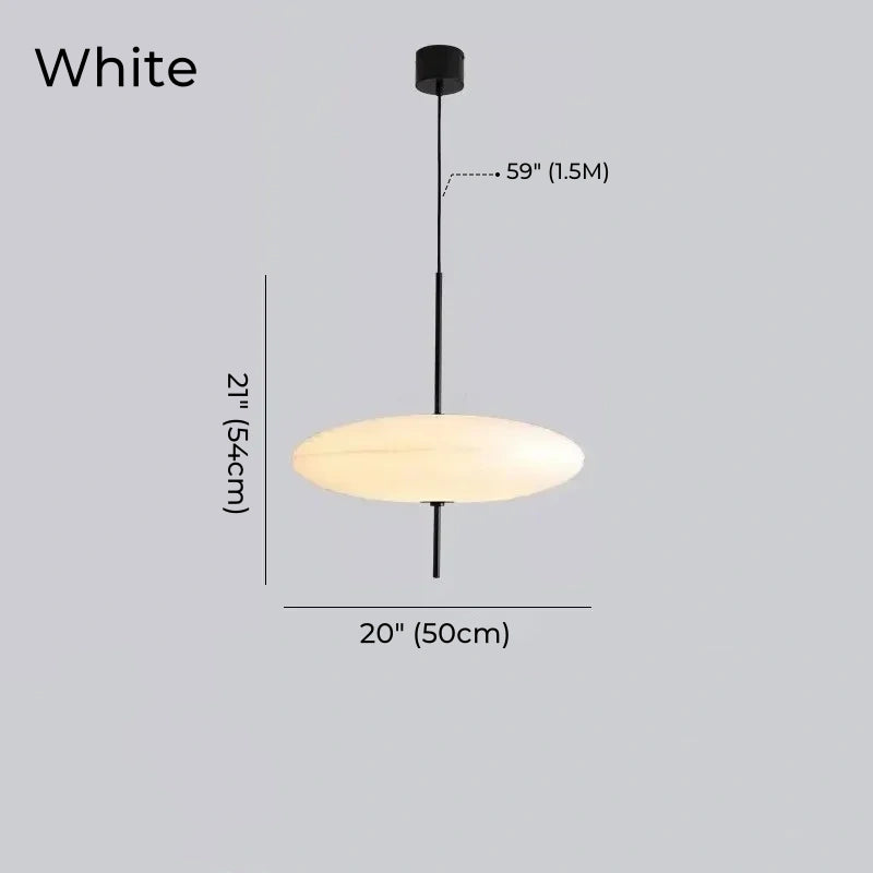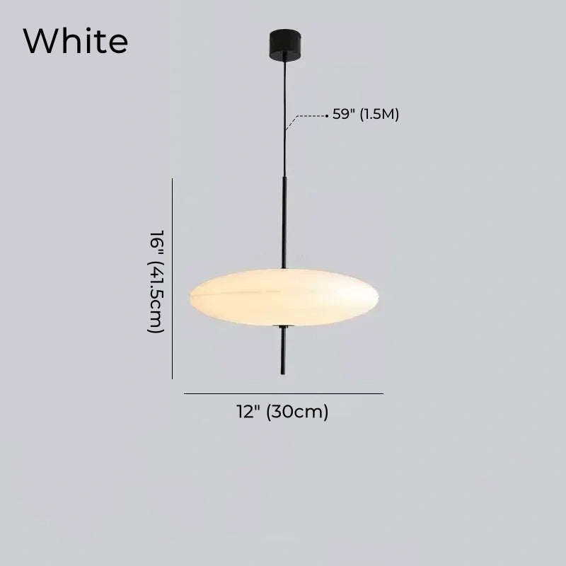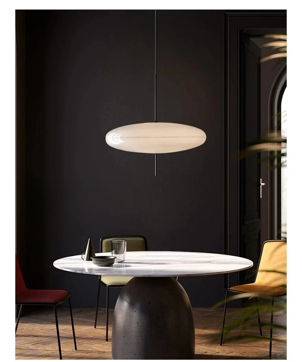 This Nordic-style pendant light features an elegant oval silhouette with a black or white metal top, a milky acrylic base, and a central gold rod accent. Available in 12" and 20" diameters, it’s perfect for kitchen islands and dining tables with a clean, modern aesthetic.